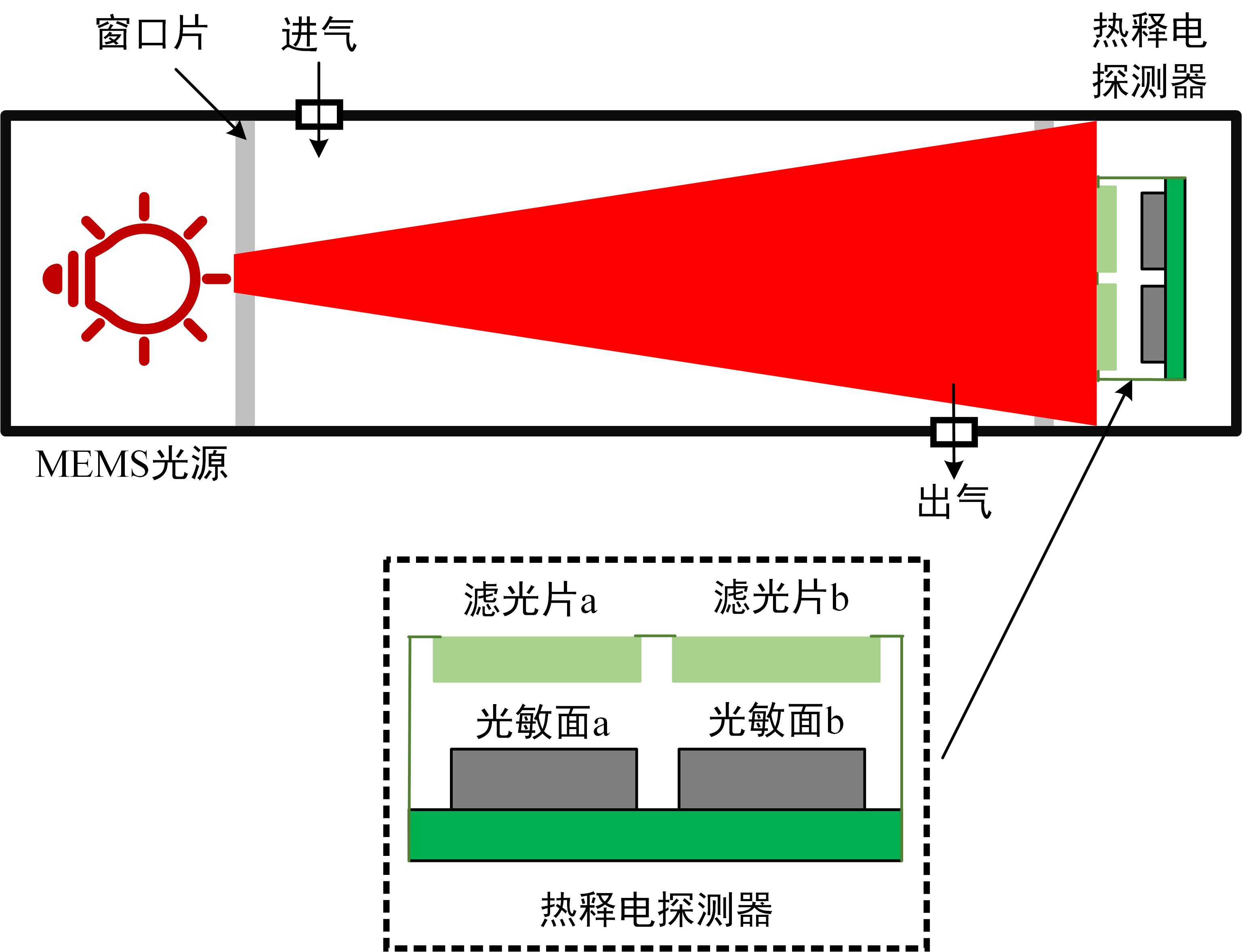 NDIR分析仪主要由MEMS光源和热释电探测器组成。MEMS光源发出的红外光,穿过气体室中的待测气体,直接照射到热释电探测器上。一路作为参比通道,实时监测光源的输出信号;另一路作为测量通道,实时监测待测气体的吸收信号。根据两个通道的比值,计算待测气体的浓度。